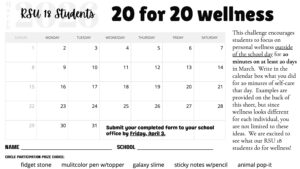 The RSU 18 Lifestyles Team is challenging students and staff to focus on personal wellness during the month of March! Students are encouraged to log 20 minutes of wellness on at least 20 days this month. Staff are encouraged to log “30 for 30.” Examples are provided, but since wellness looks different for each individual, you are not limited to these ideas. We are excited to see how our RSU 18 students and staff take care of themselves outside of school!
